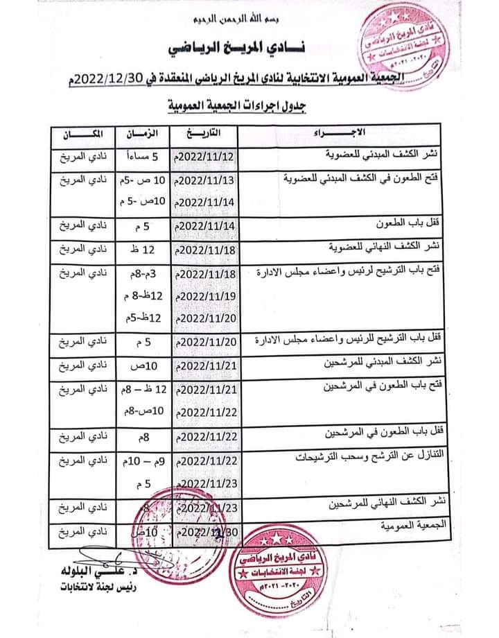 أعلنت لجنة الانتخابات جدول إجراءات الجمعية الانتخابية لنادي المريخ.