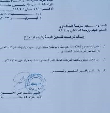 ونوه إلى أن الخطاب حوى وقف عمل الشركات داخل المعسكر سيكون لمدة أسبوع واحد لحين (معالجة الأمر) وفق ما كتب في خطاب قائد اللواء 45 مشاة العميد ركن علي محمد علي الأمين.