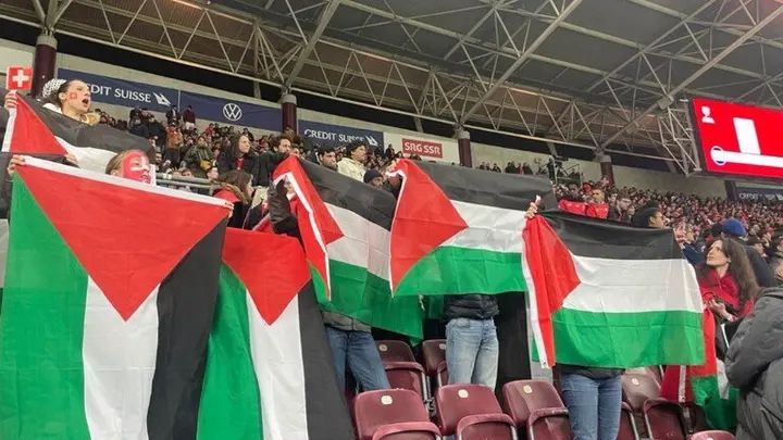 رفع مشجعون سويسريون العشرات من الأعلام الفلسطينية خلال مباراة منتخب بلادهم ضد إسرائيل، في التصفيات المؤهلة لكأس أوروبا لكرة القدم "يورو 2024".