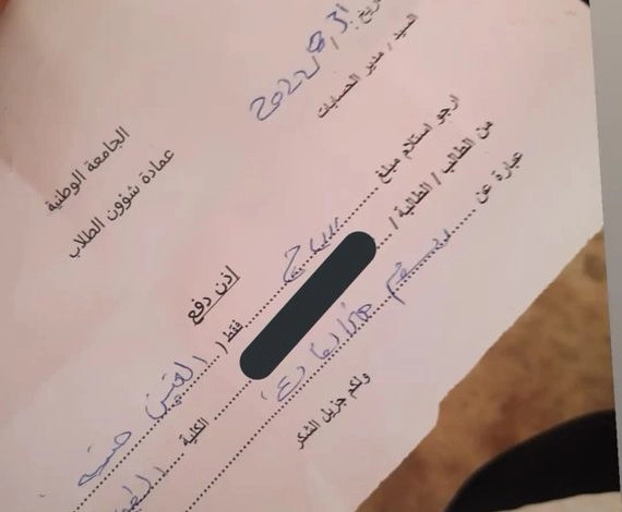 ألزمت الجامعة الوطنية امس، طالبة غرامة مالية قدرها ألفين جنيه، وذلك بسبب سقوط طرحتها من على رأسها.