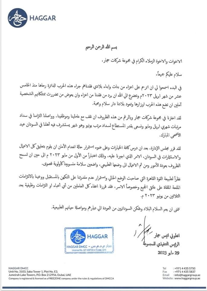 اعلنت مجموعة شركات حجار في السودان تعليق، كافة انشطتها في السودان واعفاء الموظفين من أي أعباء وظيفية اعتبارا من 30 يوليو المقبل.
