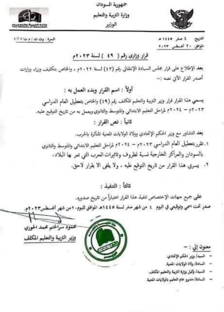 وزير التربية والتعليم في السودان، محمود سر الختم الحوري، قرارا قضى بتعطيل العام الدراسي بالبلاد وجميع المراكز الخارجية، للعام ٢٠٢٣م ‐ ٢٠٢٤م لجميع المراحل الدراسية ابتدائى. متوسط؛ ثانوي نسبة للظروف وتاثيرات الحرب التي تشهدها البلاد.