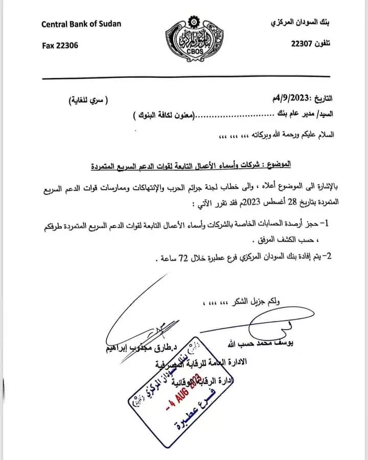 أصدر بنك السودان المركزي خطاباً وجه من خلاله جميع البنوك بحجز أموال وارصدة الحسابات الخاصة بالشركات وأسماء الأعمال التابعة لمليشيا الدعم السريع المتمردة وبحسب الخطاب فقد وجه البنك المركزي بافادة فرع البنك بعطبرة خلال 72 ساعة .