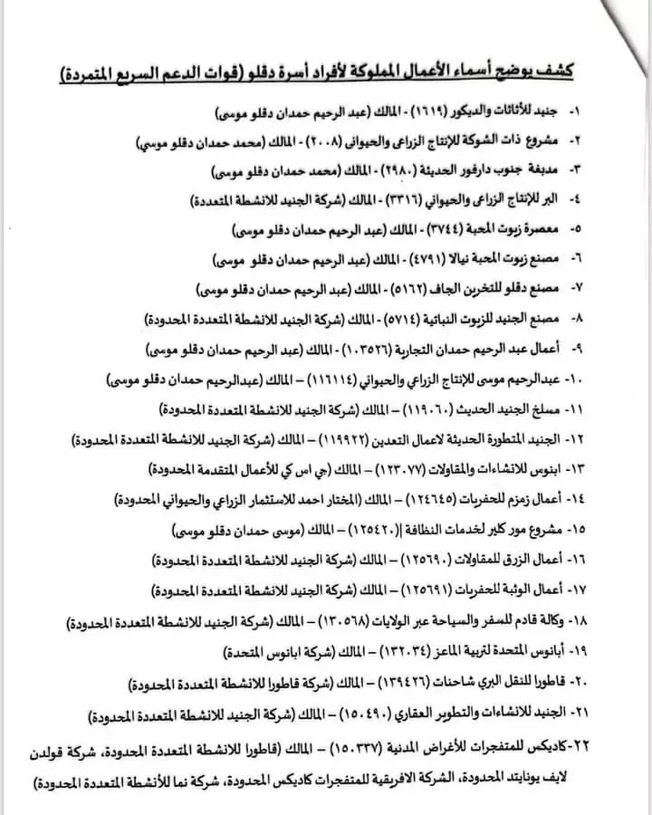 حجز أموال وحسابات (37) شركة تتبع للدعم السريع