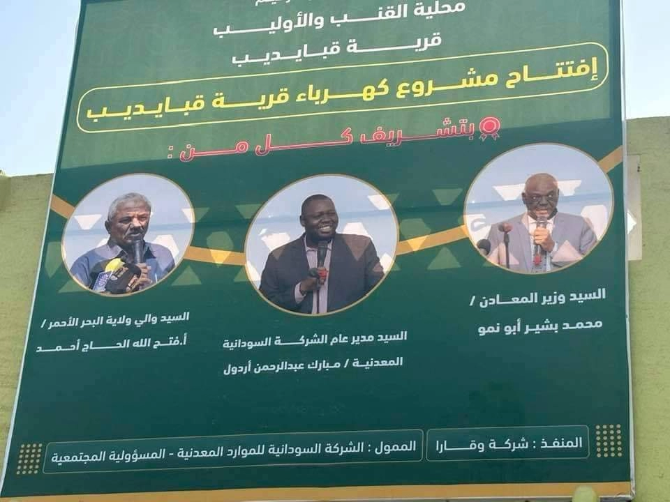افتتح بولاية البحر الاحمر مشروع كهرباء قرية_قبايديب بمحلية القنب والاوليب بحضور وزير المعادن محمد بشير أبو نمو ووالي البحر الاحمر وقائد المنطقة العسكرية ومدير شركة المعادن السودانية مبارك أردول .