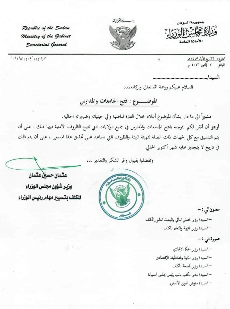 وقال قرار اصدره عثمان تحت موضوع: فتح الجامعات والمدارس، بالاشارة الى ما دار بشأن الموضوع أعلاه خلال الفترة الماضية والى حيثياته وضروراته الحالية، أرجو أن أنقل لكم التوجيه بفتح الجامعات والمدارس في جميع الولايات التي تتيح الظروف الأمنية فيها ذلك.