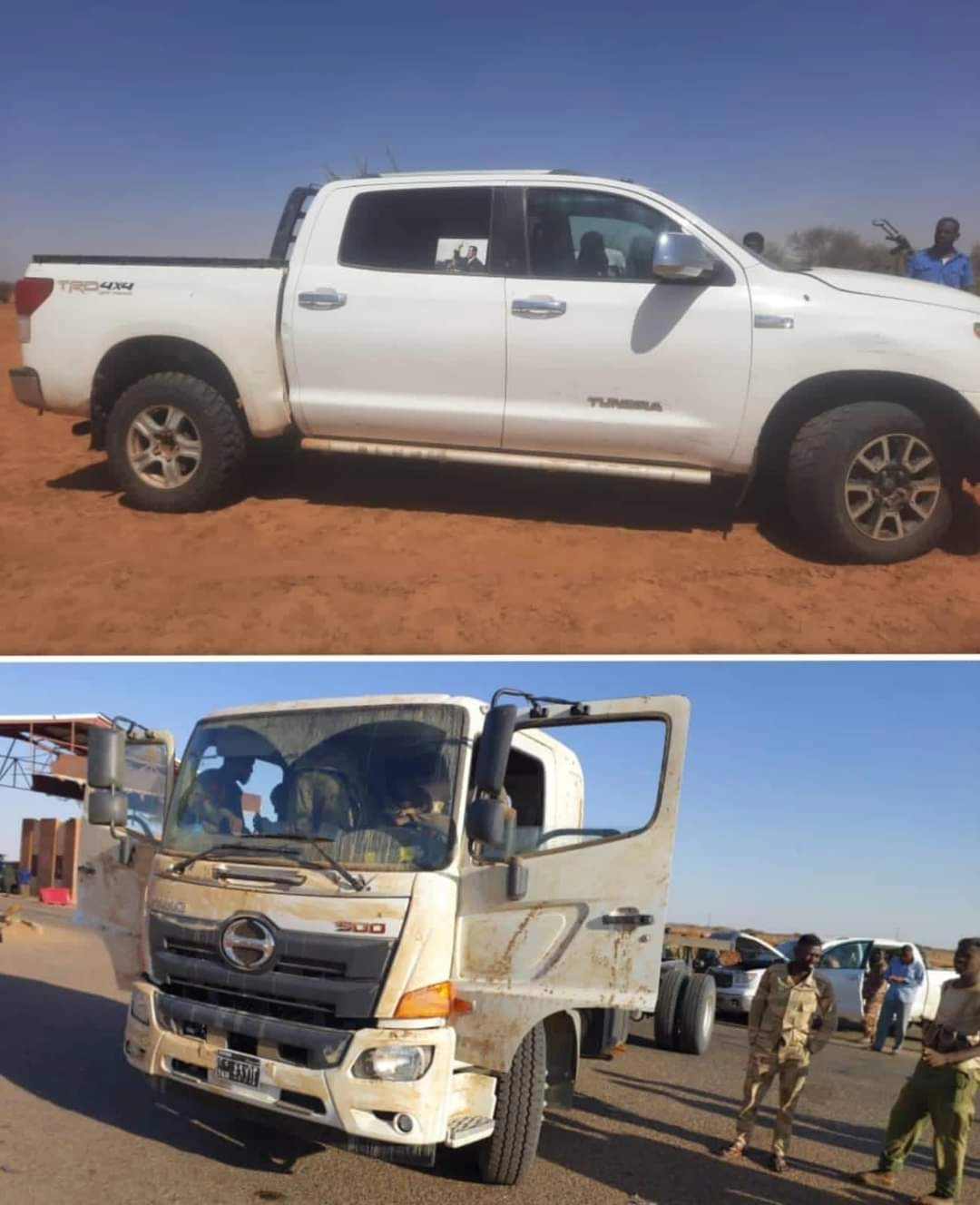 تمكنت شرطة محلية شندي "قسم شرطة قندتو"، شمال السودان، من ضبط لوري هينو ZS وعربة بوكس دبل كاب ماركة تندرا بمعية متهمان إثنان عثر بحوزتهما على جهازي إتصال بالأقمار الصناعية "ثريا" وسلاح ام16.