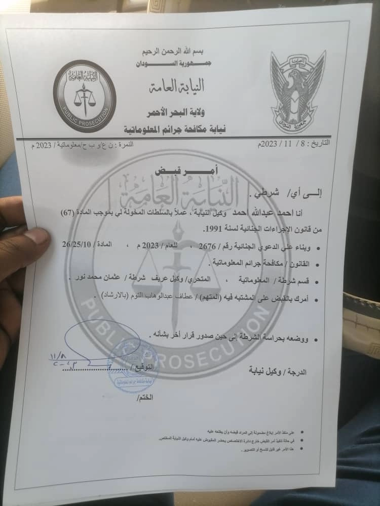 أصدر وكيل نيابة مكافحة جرائم المعلوماتية بولاية البحر الاحمر أمرا بالقبض علي الصحفي عطاف عبدالوهاب التوم بناء علي عريضة الدعوى الجنائية رقم ٢٦٧٦ للعام ٢٠٢٣م المقدمة من الامين عمر الامين (شيخ الامين) .