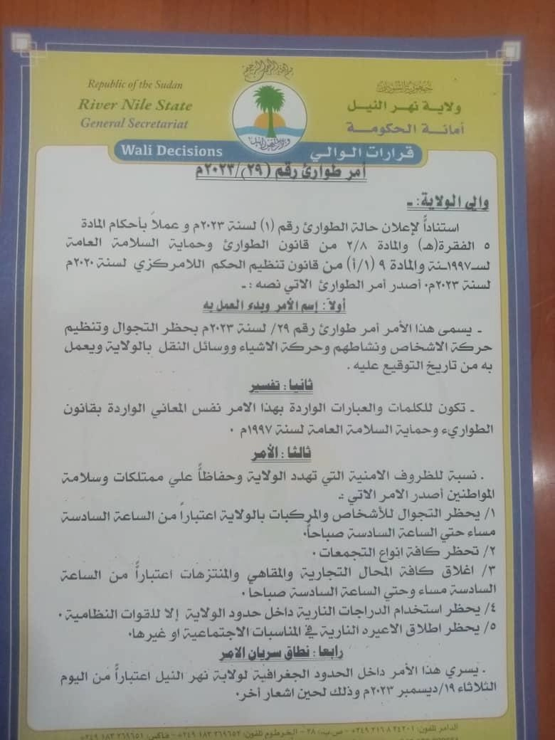 أصدر والي ولاية نهر النيل، محمد البدوي عبدالماجد، أمرًا بحظر التجوال داخل حدود الولاية، من الساعة السادسة مساءً وحتى السادسة صباحاً، مع استثناءات للكوادر الطبية والقوات النظامية، ومنع استخدام الدراجات النارية، والتجمعات