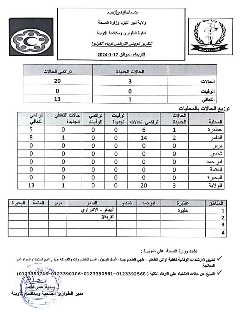 والحالات المسجلة اليوم ثلاث حالات محلية عطبرة حالة والدامر حالتين والذين تعافوا (١٣) شخصاً .
