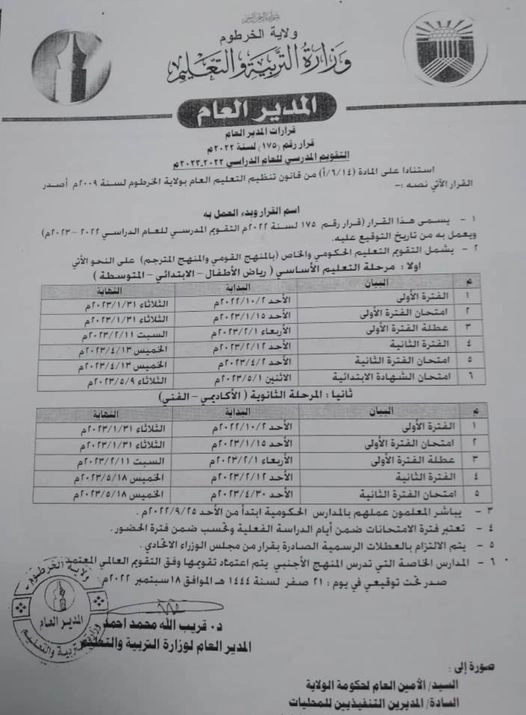 أعلنت وزارة التربية والتعليم ولاية الخرطوم، التقويم الدراسي للعام 2022- 2023 م، وأكدت بداية فتح المدارس في 2 أكتوبر المقبل.